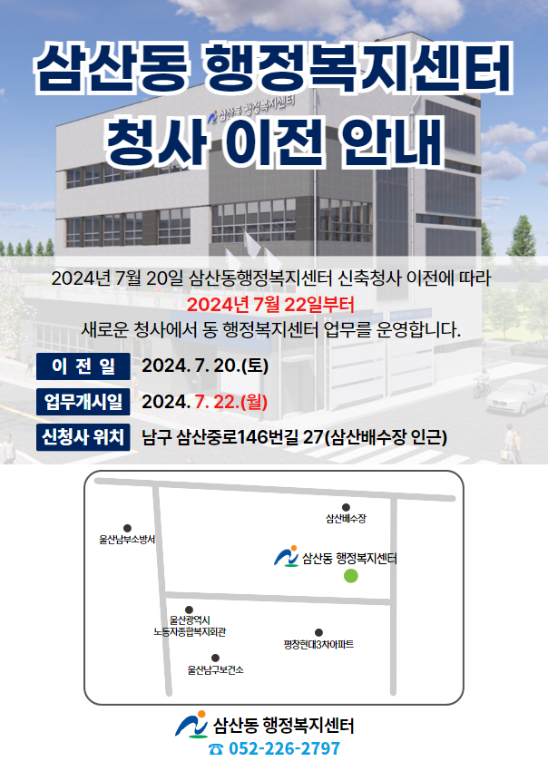 2024년 7월 24일 삼산동행정복지센터 신청사 이전!! 삼산동행정복지센터가 드디어 삼산배수장 일원 신청사로 이전을 했습니다. 그동안 삼산동행정복지센터는 하루 250~300명의 민원인이 내방하였으나 건물 노후화와 낡고 협소한 공간들로 인해 민원인들의 불편이 컸으며, 또한 주차장이 턱없이 부족하여 주민들이 불만을 호소하기도 하였습니다. 이번에 이전한 신청사에서는 부설주차장과 함께 삼산배수장 일부를 개방하여 주민 불편 해소 및 주차 편의를 제공하여 주민들의 행정민원을 적극 지원할 예정입니다. Prev이전 다음Next Leave a comment 댓글 남기기 답글 남기기 응답 취소이메일 주소는 공개되지 않습니다. 필수 필드는 *로 표시됩니다 다음 번 댓글 작성을 위해 이 브라우저에 이름, 이메일, 그리고 웹사이트를 저장합니다. Δ Related Posts 관련 글 2024년 12월 2024년 12월 정기분 자동차세 납부 안내 2024년 11월 29일 13개 댓글 2024년 12월 12월 2024년 11월 27일 27개 댓글 2024년 12월 겨울에도 남구의 밤은 더욱 빛난다. 2024년 11월 27일 3개 댓글 2024년 12월 12월 장생포문화창고엔 ‘감동과 재미’가 있다. 2024년 11월 26일 408개 댓글