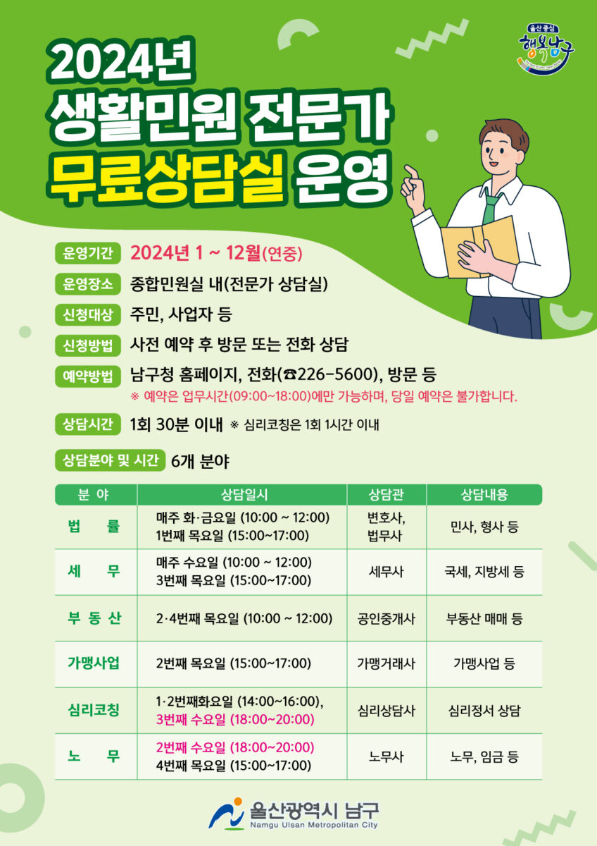 2024년 5월 20일 생활민원 전문가 무료상담실 안내 Prev이전 다음Next Leave a comment 댓글 남기기 답글 남기기 응답 취소이메일 주소는 공개되지 않습니다. 필수 필드는 *로 표시됩니다 다음 번 댓글 작성을 위해 이 브라우저에 이름, 이메일, 그리고 웹사이트를 저장합니다. Δ Related Posts 관련 글 2024년 12월 2024년 12월 정기분 자동차세 납부 안내 2024년 11월 29일 10개 댓글 2024년 12월 12월 2024년 11월 27일 26개 댓글 2024년 12월 겨울에도 남구의 밤은 더욱 빛난다. 2024년 11월 27일 2개 댓글 2024년 12월 12월 장생포문화창고엔 ‘감동과 재미’가 있다. 2024년 11월 26일 408개 댓글