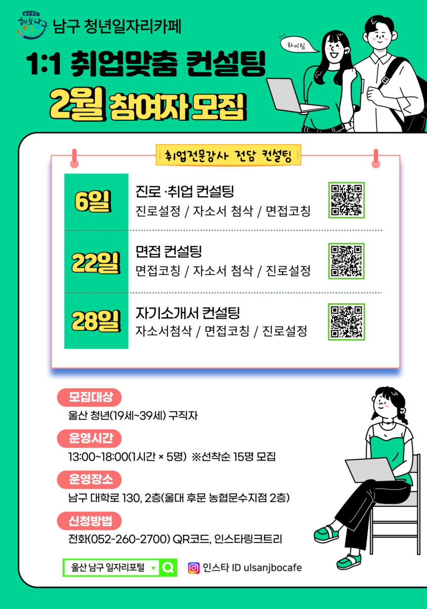 2024년 1월 25일 1:1 취업맞춤 컨설팅 안내 Prev이전 다음Next Leave a comment 댓글 남기기 답글 남기기 응답 취소이메일 주소는 공개되지 않습니다. 필수 필드는 *로 표시됩니다 다음 번 댓글 작성을 위해 이 브라우저에 이름, 이메일, 그리고 웹사이트를 저장합니다. Δ Related Posts 관련 글 2024년 12월 2024년 12월 정기분 자동차세 납부 안내 2024년 11월 29일 10개 댓글 2024년 12월 12월 2024년 11월 27일 26개 댓글 2024년 12월 겨울에도 남구의 밤은 더욱 빛난다. 2024년 11월 27일 2개 댓글 2024년 12월 12월 장생포문화창고엔 ‘감동과 재미’가 있다. 2024년 11월 26일 408개 댓글
